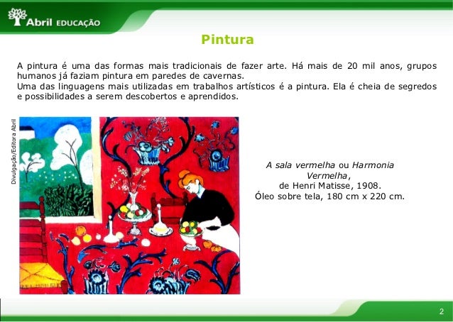 2. 2. Pintura A pintura é uma das formas mais tradicionais de fazer arte. Há mais de 20 mil anos, grupos humanos já faziam pintura em paredes de cavernas. Uma das linguagens mais utilizadas em trabalhos artísticos é a pintura. Ela é cheia de segredos e possibilidades a serem descobertos e aprendidos.Divulgação/Editora Abril A sala vermelha ou Harmonia Vermelha, de Henri Matisse, 1908. Óleo sobre tela, 180 cm x 220 cm. 2
