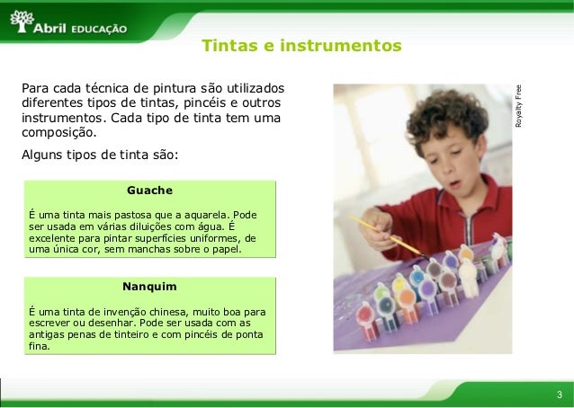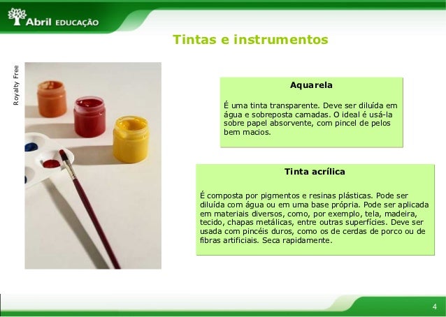 4. 4. Tintas e instrumentosRoyalty Free Aquarela É uma tinta transparente. Deve ser diluída em água e sobreposta camadas. O ideal é usá-la sobre papel absorvente, com pincel de pelos bem macios. Tinta acrílica É composta por pigmentos e resinas plásticas. Pode ser diluída com água ou em uma base própria. Pode ser aplicada em materiais diversos, como, por exemplo, tela, madeira, tecido, chapas metálicas, entre outras superfícies. Deve ser usada com pincéis duros, como os de cerdas de porco ou de fibras artificiais. Seca rapidamente. 4