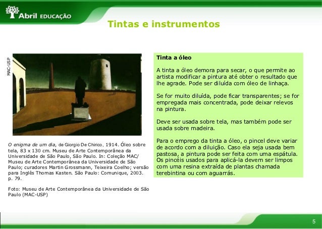 5. 5. Tintas e instrumentos Tinta a óleoMAC-USP A tinta a óleo demora para secar, o que permite ao artista modificar a pintura até obter o resultado que lhe agrade. Pode ser diluída com óleo de linhaça. Se for muito diluída, pode ficar transparentes; se for empregada mais concentrada, pode deixar relevos na pintura. Deve ser usada sobre tela, mas também pode ser usada sobre madeira. Para o emprego da tinta a óleo, o pincel deve variar O enigma de um dia, de Giorgio De Chirico, 1914. Óleo sobre de acordo com a diluição. Caso ela seja usada bem tela, 83 x 130 cm. Museu de Arte Contemporânea da Universidade de São Paulo, São Paulo. In: Coleção MAC/ pastosa, a pintura pode ser feita com uma espátula. Museu de Arte Contemporânea da Universidade de São Os pincéis usados para aplicá-la devem ser limpos Paulo; curadores Martin Grossmann, Teixeira Coelho; versão com uma resina extraída de plantas chamada para Inglês Thomas Kasten. São Paulo: Comunique, 2003. terebintina ou com aguarrás. p. 79. Foto: Museu de Arte Contemporânea da Universidade de São Paulo (MAC-USP) 5