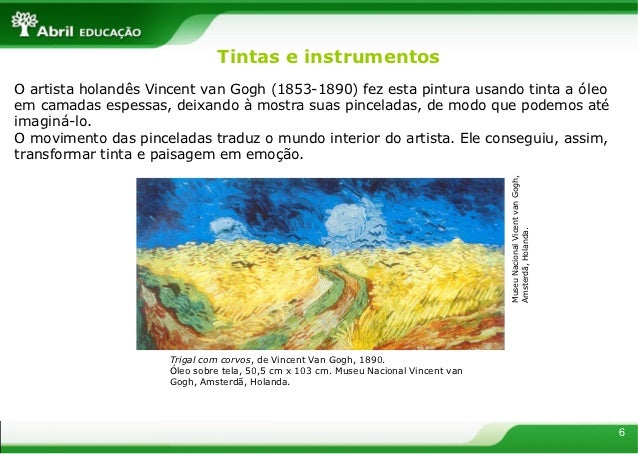 6. 6. Tintas e instrumentosO artista holandês Vincent van Gogh (1853-1890) fez esta pintura usando tinta a óleoem camadas espessas, deixando à mostra suas pinceladas, de modo que podemos atéimaginá-lo.O movimento das pinceladas traduz o mundo interior do artista. Ele conseguiu, assim,transformar tinta e paisagem em emoção. Museu Nacional Vicent van Gogh, Amsterdã, Holanda. Trigal com corvos, de Vincent Van Gogh, 1890. Óleo sobre tela, 50,5 cm x 103 cm. Museu Nacional Vincent van Gogh, Amsterdã, Holanda.   6