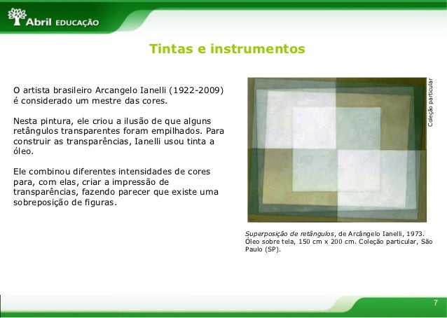 7. 7. Tintas e instrumentos Coleção particularO artista brasileiro Arcangelo Ianelli (1922-2009)é considerado um mestre das cores.Nesta pintura, ele criou a ilusão de que algunsretângulos transparentes foram empilhados. Paraconstruir as transparências, Ianelli usou tinta aóleo.Ele combinou diferentes intensidades de corespara, com elas, criar a impressão detransparências, fazendo parecer que existe umasobreposição de figuras. Superposição de retângulos, de Arcângelo Ianelli, 1973. Óleo sobre tela, 150 cm x 200 cm. Coleção particular, São Paulo (SP). 7
