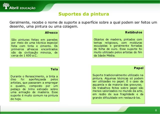 8. 8. Suportes da pinturaGeralmente, recebe o nome de suporte a superfície sobre a qual podem ser feitos umdesenho, uma pintura ou uma colagem. Afresco Retábulos São pinturas feitas em paredes Objetos de madeira, pintados com por meio de uma técnica especial temas religiosos, com molduras feita com tinta e cimento. Os esculpidas e geralmente forradas primeiros afrescos encontrados de folha de ouro. Esse suporte foi são da civilização minoica, de muito utilizado pelos artistas do fim cerca de 1 600 a.C. da Idade Média. Tela PapelDurante o Renascimento, a tinta a Suporte tradicionalmente utilizado naóleo foi aperfeiçoada pelos pintura. Algumas técnicas só podemartistas, que passaram a empregar ser utilizadas no papel. É o caso dao quadro, composto por um aquarela e da maioria das gravuras.pedaço de linho esticado sobre Os trabalhos feitos sobre papel sãouma armação de madeira. Esse menos valorizados no mundo da arte,suporte é muito comum na pintura em razão de sua fragilidade e dade hoje. grande dificuldade em restaurá-los. 8