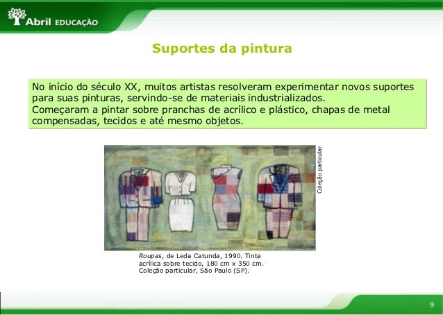 9. 9. Suportes da pinturaNo início do século XX, muitos artistas resolveram experimentar novos suportespara suas pinturas, servindo-se de materiais industrializados.Começaram a pintar sobre pranchas de acrílico e plástico, chapas de metalcompensadas, tecidos e até mesmo objetos. Coleção particular Roupas, de Leda Catunda, 1990. Tinta acrílica sobre tecido, 180 cm x 350 cm. Coleção particular, São Paulo (SP). 9