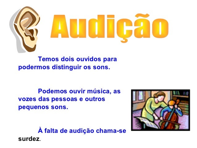 2. 2. Temos dois ouvidos parapodermos distinguir os sons. Podemos ouvir música, asvozes das pessoas e outrospequenos sons. À falta de audição chama-sesurdez.