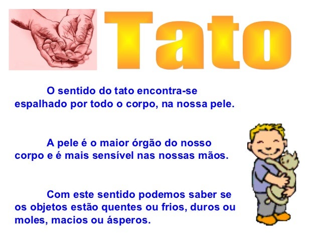 6. 6. O sentido do tato encontra-seespalhado por todo o corpo, na nossa pele. A pele é o maior órgão do nossocorpo e é mais sensível nas nossas mãos. Com este sentido podemos saber seos objetos estão quentes ou frios, duros oumoles, macios ou ásperos.