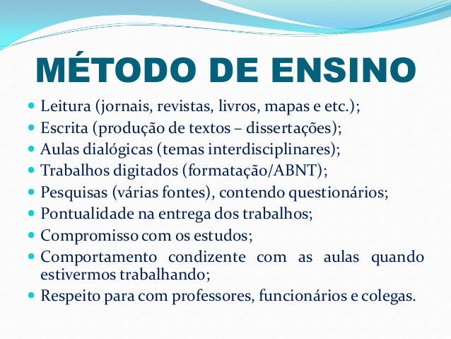 2. 2. MÉTODO DE ENSINO Leitura (jornais, revistas, livros, mapas e etc.); Escrita (produção de textos – dissertações); Aulas dialógicas (temas interdisciplinares); Trabalhos digitados (formatação/ABNT); Pesquisas (várias fontes), contendo questionários; Pontualidade na entrega dos trabalhos; Compromisso com os estudos; Comportamento condizente com as aulas quandoestivermos trabalhando; Respeito para com professores, funcionários e colegas.