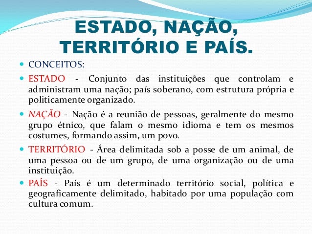 ESTADO, NAÇÃO,TERRITÓRIO E PAÍS. CONCEITOS: ESTADO - Conjunto das instituições que controlam eadministram uma nação; paí...