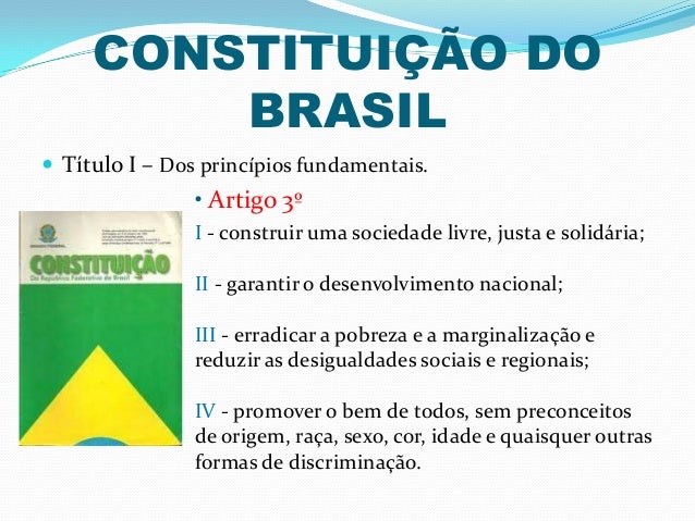 6. 6. CONSTITUIÇÃO DOBRASIL Título I – Dos princípios fundamentais.• Artigo 3ºI - construir uma sociedade livre, justa e solidária;II - garantir o desenvolvimento nacional;III - erradicar a pobreza e a marginalização ereduzir as desigualdades sociais e regionais;IV - promover o bem de todos, sem preconceitosde origem, raça, sexo, cor, idade e quaisquer outrasformas de discriminação.