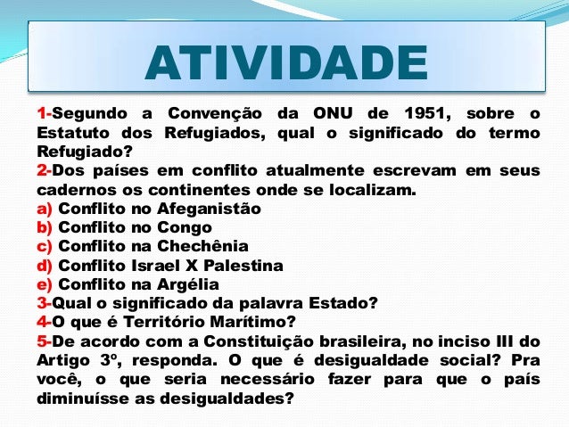 7. 7. ATIVIDADE1-Segundo a Convenção da ONU de 1951, sobre oEstatuto dos Refugiados, qual o significado do termoRefugiado?2-Dos países em conflito atualmente escrevam em seuscadernos os continentes onde se localizam.a) Conflito no Afeganistãob) Conflito no Congoc) Conflito na Chechêniad) Conflito Israel X Palestinae) Conflito na Argélia3-Qual o significado da palavra Estado?4-O que é Território Marítimo?5-De acordo com a Constituição brasileira, no inciso III doArtigo 3º, responda. O que é desigualdade social? Pravocê, o que seria necessário fazer para que o paísdiminuísse as desigualdades?