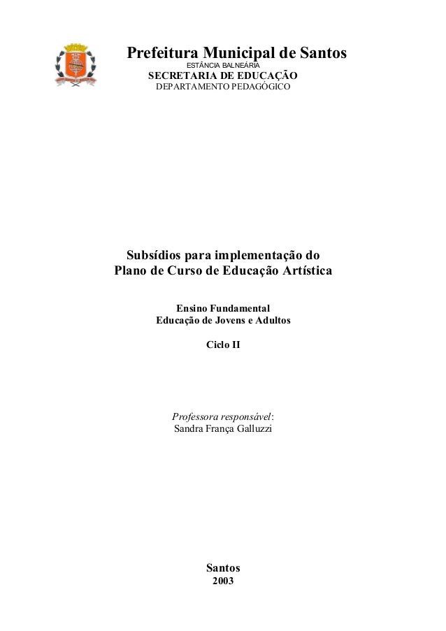 1. 1. Prefeitura Municipal de Santos ESTÂNCIA BALNEÁRIA SECRETARIA DE EDUCAÇÃO DEPARTAMENTO PEDAGÓGICO Subsídios para implementação doPlano de Curso de Educação Artística Ensino Fundamental Educação de Jovens e Adultos Ciclo II Professora responsável: Sandra França Galluzzi Santos 2003