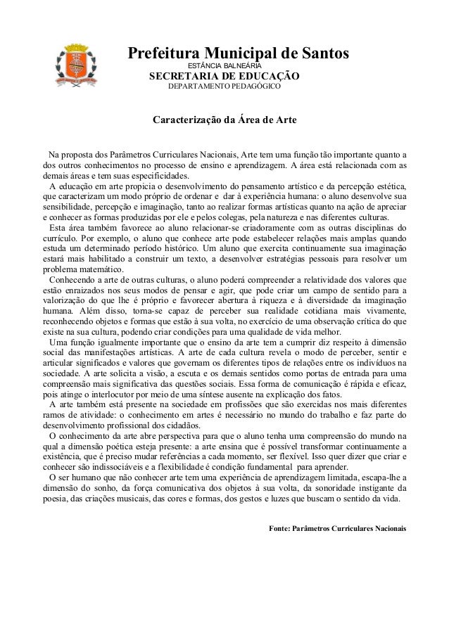 3. 3. Prefeitura Municipal de Santos ESTÂNCIA BALNEÁRIA SECRETARIA DE EDUCAÇÃO DEPARTAMENTO PEDAGÓGICO Caracterização da Área de Arte Na proposta dos Parâmetros Curriculares Nacionais, Arte tem uma função tão importante quanto ados outros conhecimentos no processo de ensino e aprendizagem. A área está relacionada com asdemais áreas e tem suas especificidades. A educação em arte propicia o desenvolvimento do pensamento artístico e da percepção estética,que caracterizam um modo próprio de ordenar e dar à experiência humana: o aluno desenvolve suasensibilidade, percepção e imaginação, tanto ao realizar formas artísticas quanto na ação de apreciare conhecer as formas produzidas por ele e pelos colegas, pela natureza e nas diferentes culturas. Esta área também favorece ao aluno relacionar-se criadoramente com as outras disciplinas docurrículo. Por exemplo, o aluno que conhece arte pode estabelecer relações mais amplas quandoestuda um determinado período histórico. Um aluno que exercita continuamente sua imaginaçãoestará mais habilitado a construir um texto, a desenvolver estratégias pessoais para resolver umproblema matemático. Conhecendo a arte de outras culturas, o aluno poderá compreender a relatividade dos valores queestão enraizados nos seus modos de pensar e agir, que pode criar um campo de sentido para avalorização do que lhe é próprio e favorecer abertura à riqueza e à diversidade da imaginaçãohumana. Além disso, torna-se capaz de perceber sua realidade cotidiana mais vivamente,reconhecendo objetos e formas que estão à sua volta, no exercício de uma observação crítica do queexiste na sua cultura, podendo criar condições para uma qualidade de vida melhor. Uma função igualmente importante que o ensino da arte tem a cumprir diz respeito à dimensãosocial das manifestações artísticas. A arte de cada cultura revela o modo de perceber, sentir earticular significados e valores que governam os diferentes tipos de relações entre os indivíduos nasociedade. A arte solicita a visão, a escuta e os demais sentidos como portas de entrada para umacompreensão mais significativa das questões sociais. Essa forma de comunicação é rápida e eficaz,pois atinge o interlocutor por meio de uma síntese ausente na explicação dos fatos. A arte também está presente na sociedade em profissões que são exercidas nos mais diferentesramos de atividade: o conhecimento em artes é necessário no mundo do trabalho e faz parte dodesenvolvimento profissional dos cidadãos. O conhecimento da arte abre perspectiva para que o aluno tenha uma compreensão do mundo naqual a dimensão poética esteja presente: a arte ensina que é possível transformar continuamente aexistência, que é preciso mudar referências a cada momento, ser flexível. Isso quer dizer que criar econhecer são indissociáveis e a flexibilidade é condição fundamental para aprender. O ser humano que não conhecer arte tem uma experiência de aprendizagem limitada, escapa-lhe adimensão do sonho, da força comunicativa dos objetos à sua volta, da sonoridade instigante dapoesia, das criações musicais, das cores e formas, dos gestos e luzes que buscam o sentido da vida. Fonte: Parâmetros Curriculares Nacionais