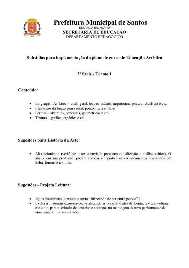 4. 4. Prefeitura Municipal de Santos ESTÂNCIA BALNEÁRIA SECRETARIA DE EDUCAÇÃO DEPARTAMENTO PEDAGÓGICO Subsídios para implementação do plano de curso de Educação Artística 5ª Série - Termo 1Conteúdo: • Linguagem Artística – visão geral: teatro, música, arquitetura, pintura, escultura e etc. • Elementos da linguagem visual: ponto, linha e plano • Formas – abstratas, concretas, geométricas e etc. • Textura – gráfica, orgânica e etc.Sugestões para História da Arte: • Abstracionismo (verifique o texto enviado para contextualização e análise crítica). O aluno, em sua produção, poderá colocar em prática os conhecimentos adquiridos em linha, formas e texturas.Sugestões - Projeto Leitura: • Jogos dramáticos (consulte o texto “Brincando de ser outra pessoa” ) • Explorar materiais expressivos, verificando as possibilidades de forma, textura, volume, cor e etc, para a criação de cenários e adereços na montagem de uma performance de uma cena do livro escolhido.