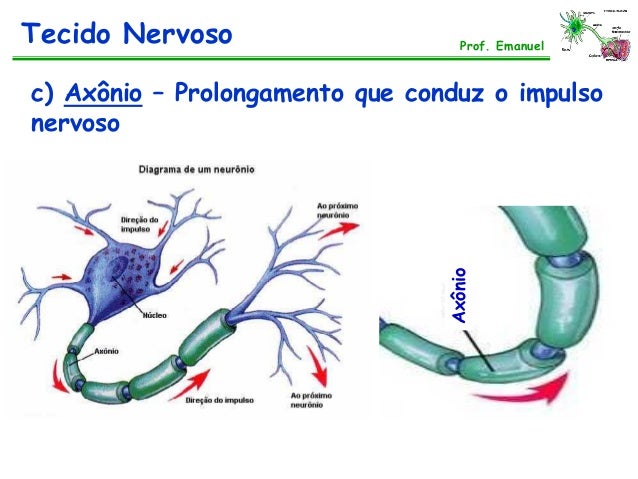 10. 10. c) Axônio – Prolongamento que conduz o impulso nervoso Tecido Nervoso Prof. Emanuel Axônio
