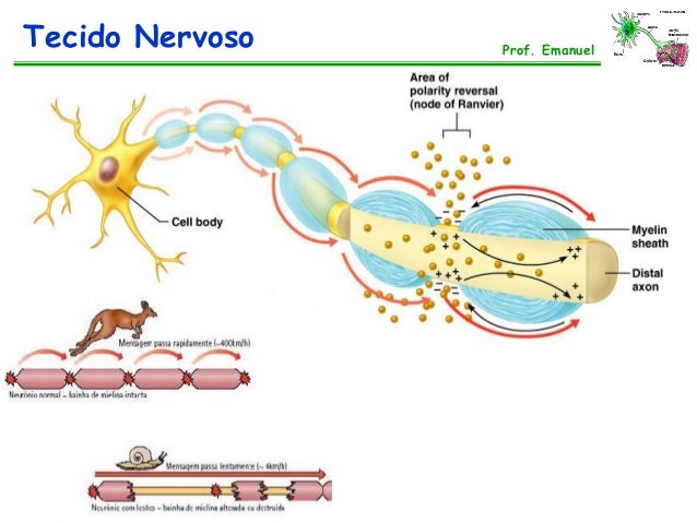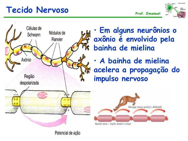 12. 12. • Em alguns neurônios o axônio é envolvido pela bainha de mielina • A bainha de mielina acelera a propagação do impulso nervoso Tecido Nervoso Prof. Emanuel Bainha de mielina