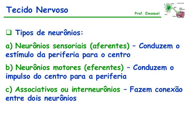 14. 14.  Tipos de neurônios: a) Neurônios sensoriais (aferentes) – Conduzem o estímulo da periferia para o centro b) Neurônios motores (eferentes) – Conduzem o impulso do centro para a periferia c) Associativos ou interneurônios – Fazem conexão entre dois neurônios Tecido Nervoso Prof. Emanuel