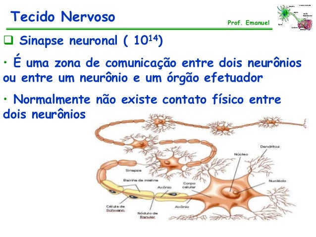 16. 16.  Sinapse neuronal ( 1014) • É uma zona de comunicação entre dois neurônios ou entre um neurônio e um órgão efetuador • Normalmente não existe contato físico entre dois neurônios Tecido Nervoso Prof. Emanuel