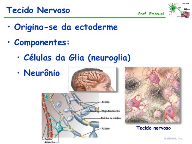 2. 2. Tecido Nervoso • Origina-se da ectoderme • Componentes: • Células da Glia (neuroglia) • Neurônio Prof. Emanuel Tecido nervoso