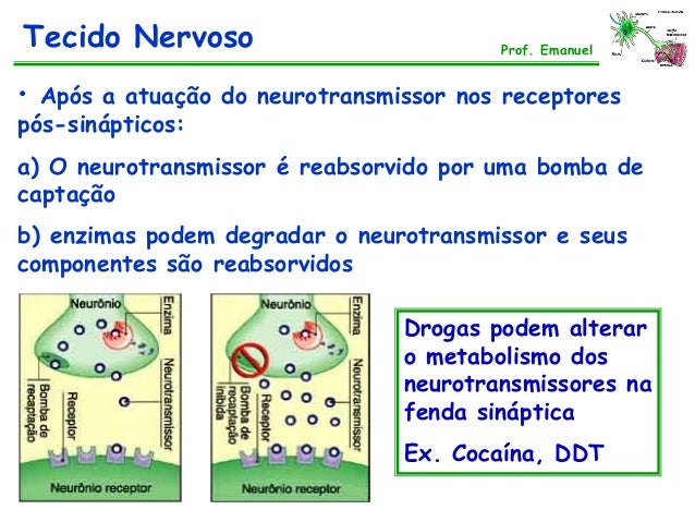 21. 21. Tecido Nervoso Prof. Emanuel • Após a atuação do neurotransmissor nos receptores pós-sinápticos: a) O neurotransmissor é reabsorvido por uma bomba de captação b) enzimas podem degradar o neurotransmissor e seus componentes são reabsorvidos Drogas podem alterar o metabolismo dos neurotransmissores na fenda sináptica Ex. Cocaína, DDT