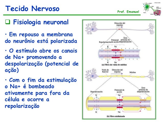 22. 22.  Fisiologia neuronal • Em repouso a membrana do neurônio está polarizada • O estímulo abre os canais de Na+ promovendo a despolarização (potencial de ação) • Com o fim da estimulação o Na+ é bombeado ativamente para fora da célula e ocorre a repolarização Potencial de repouso Tecido Nervoso Prof. Emanuel
