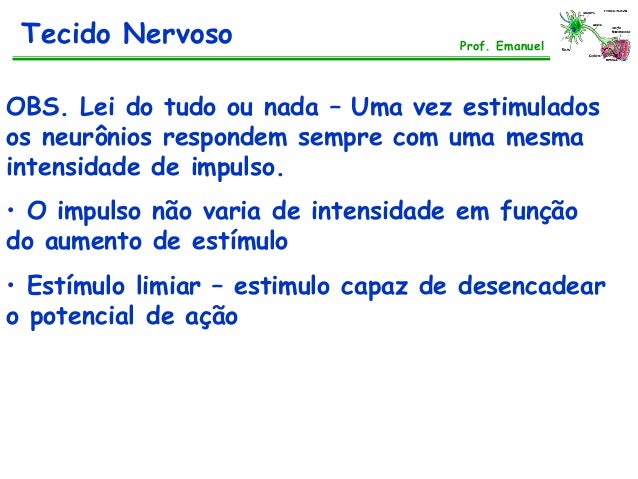 23. 23. OBS. Lei do tudo ou nada – Uma vez estimulados os neurônios respondem sempre com uma mesma intensidade de impulso. • O impulso não varia de intensidade em função do aumento de estímulo • Estímulo limiar – estimulo capaz de desencadear o potencial de ação Tecido Nervoso Prof. Emanuel