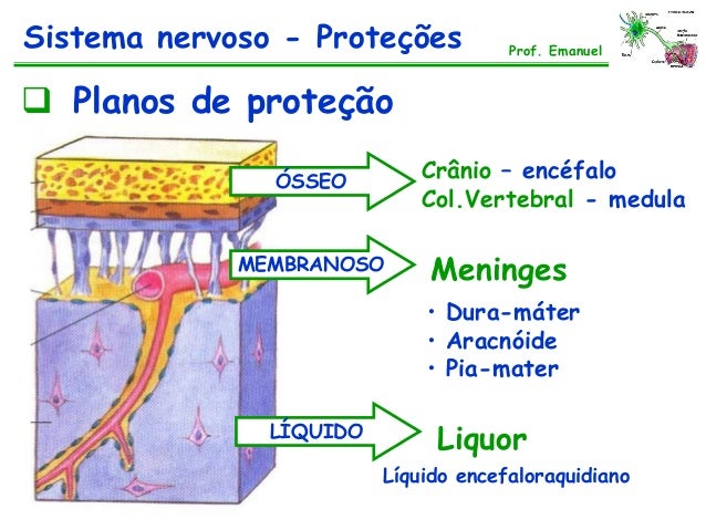 25. 25.  Planos de proteção ÓSSEO Crânio – encéfalo Col.Vertebral - medula MEMBRANOSO Meninges • Dura-máter • Aracnóide • Pia-mater LÍQUIDO Liquor Líquido encefaloraquidiano Prof. Emanuel Sistema nervoso - Proteções
