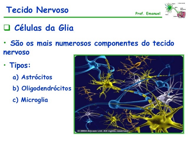 3. 3.  Células da Glia • São os mais numerosos componentes do tecido nervoso • Tipos: a) Astrócitos b) Oligodendrócitos c) Microglia Tecido Nervoso Prof. Emanuel