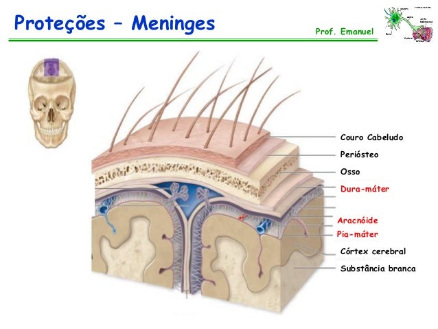 32. 32. Prof. Emanuel Proteções – Meninges Pia-máter Dura-máter Aracnóide Vaso Osso Encéfalo