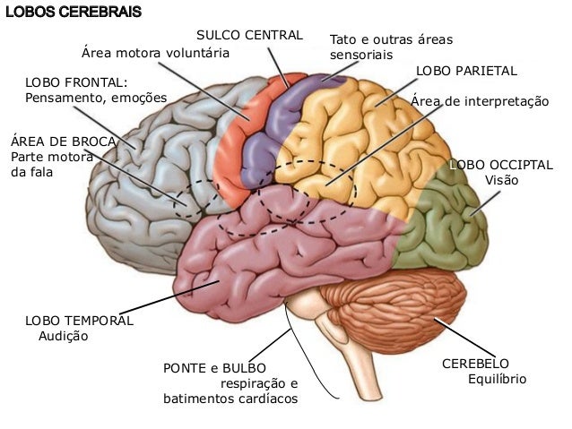 44. 44. LOBOS CEREBRAIS LOBO FRONTAL: Pensamento, emoções ÁREA DE BROCA Parte motora da fala Área motora voluntária SULCO CENTRAL Tato e outras áreas sensoriais LOBO PARIETAL Área de interpretação LOBO OCCIPTAL Visão CEREBELO Equilíbrio PONTE e BULBO respiração e batimentos cardíacos LOBO TEMPORAL Audição