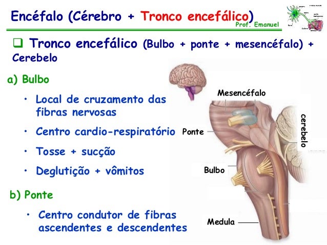 46. 46.  Tronco encefálico (Bulbo + ponte + mesencéfalo) + Cerebelo Encéfalo (Cérebro + Tronco encefálico)Prof. Emanuel Bulbo Ponte a) Bulbo • Local de cruzamento das fibras nervosas • Centro cardio-respiratório • Tosse + sucção • Deglutição + vômitos b) Ponte • Centro condutor de fibras ascendentes e descendentes Medula Mesencéfalo cerebelo