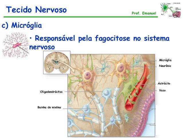 5. 5. c) Micróglia • Responsável pela fagocitose no sistema nervoso Tecido Nervoso Prof. Emanuel Micróglia Neurônio Astrócito Vaso Oligodendrócitos Bainha de mielina