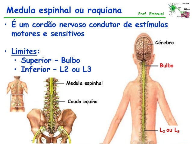49. 49. Medula espinhal ou raquiana Prof. Emanuel • É um cordão nervoso condutor de estímulos motores e sensitivos • Limites: • Superior – Bulbo • Inferior – L2 ou L3 Cauda equína Medula espinhal Bulbo L2 ou L3 Cérebro