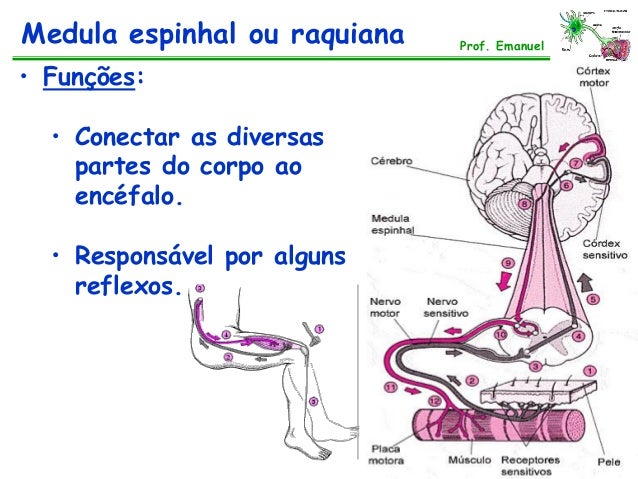 50. 50. Medula espinhal ou raquiana Prof. Emanuel • Funções: • Conectar as diversas partes do corpo ao encéfalo. • Responsável por alguns reflexos.