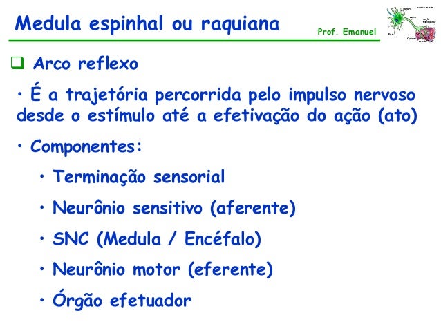 55. 55.  Arco reflexo • É a trajetória percorrida pelo impulso nervoso desde o estímulo até a efetivação do ação (ato) • Componentes: • Terminação sensorial • Neurônio sensitivo (aferente) • SNC (Medula / Encéfalo) • Neurônio motor (eferente) • Órgão efetuador Medula espinhal ou raquiana Prof. Emanuel