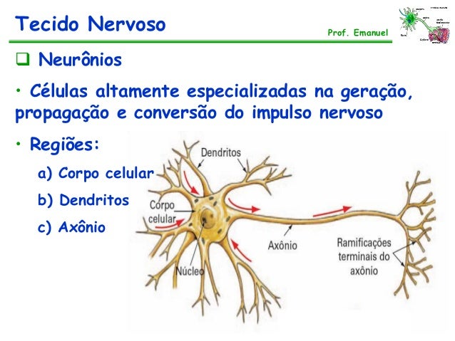 6. 6. Tecido Nervoso Prof. Emanuel  Neurônios • Células altamente especializadas na geração, propagação e conversão do impulso nervoso • Regiões: a) Corpo celular b) Dendritos c) Axônio