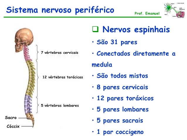 61. 61.  Nervos espinhais • São 31 pares • Conectados diretamente a medula • São todos mistos • 8 pares cervicais • 12 pares toráxicos • 5 pares lombares • 5 pares sacrais • 1 par coccigeno Sistema nervoso periférico Prof. Emanuel 7 vértebras cervicais 12 vértebras torácicas 5 vértebras lombares Sacro Cóccix