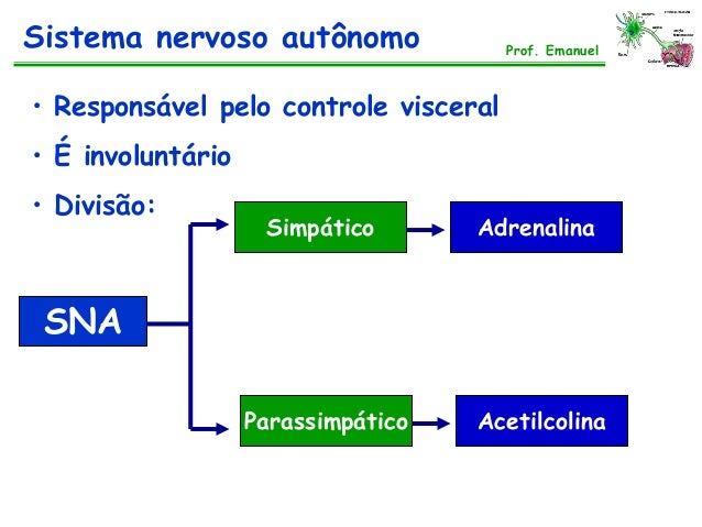 62. 62. • Responsável pelo controle visceral • É involuntário • Divisão: Sistema nervoso autônomo Prof. Emanuel SNA Simpático Parassimpático Adrenalina Acetilcolina