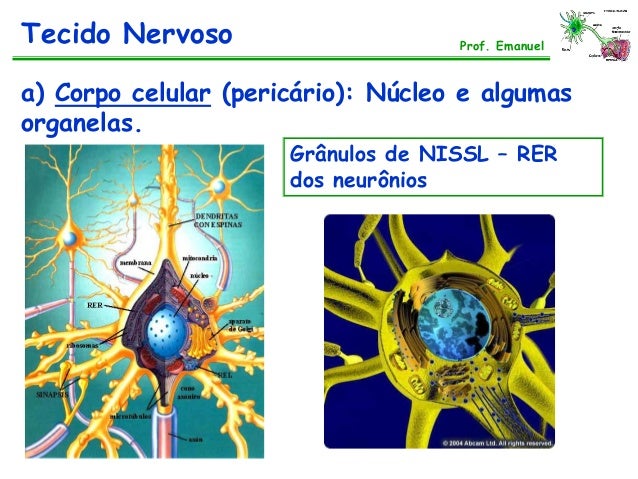8. 8. a) Corpo celular (pericário): Núcleo e algumas organelas. Grânulos de NISSL – RER dos neurônios Tecido Nervoso Prof. Emanuel