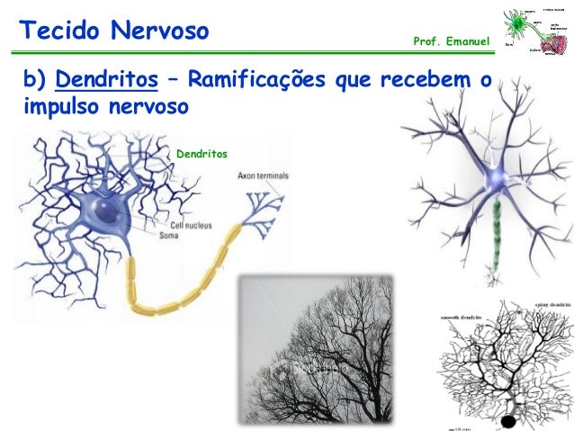 9. 9. Tecido Nervoso Prof. Emanuel Dendritos b) Dendritos – Ramificações que recebem o impulso nervoso