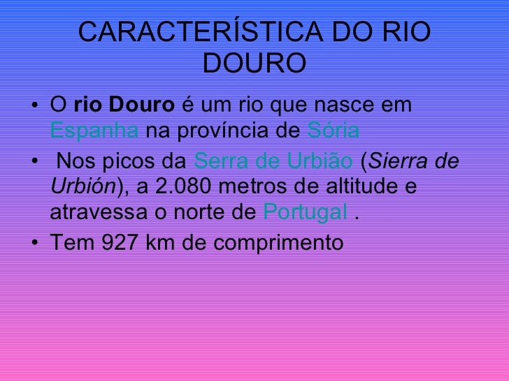 2. 2. CARACTERÍSTICA DO RIO DOURO <ul><li>O rio Douro é um rio que nasce em Espanha na província de Sória </li></ul><ul><li>Nos picos da Serra de Urbião ( Sierra de Urbión ), a 2.080 metros de altitude e atravessa o norte de Portugal . </li></ul><ul><li>Tem 927 km de comprimento </li></ul>