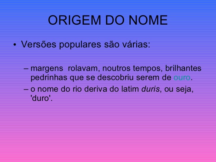 3. 3. ORIGEM DO NOME <ul><li>Versões populares são várias: </li></ul><ul><ul><li>margens rolavam, noutros tempos, brilhantes pedrinhas que se descobriu serem de ouro . </li></ul></ul><ul><ul><li>o nome do rio deriva do latim duris , ou seja, 'duro'. </li></ul></ul>