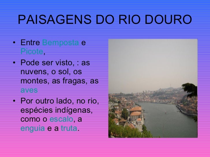 4. 4. PAISAGENS DO RIO DOURO <ul><li>Entre Bemposta e Picote , </li></ul><ul><li>Pode ser visto, : as nuvens, o sol, os montes, as fragas, as aves </li></ul><ul><li>Por outro lado, no rio, espécies indígenas, como o escalo , a enguia e a truta . </li></ul>