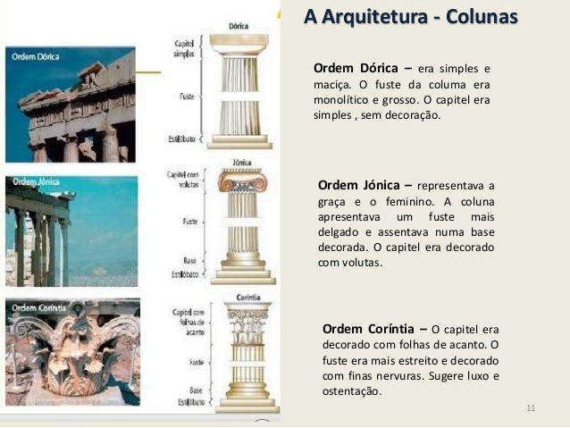 9. 9. A Arquitetura – O TemploO templo grego é uma das tipologias arquitectónicas de maior relevo na Grécia Antiga.A caracteristicas mais evidente dos templos gregos é a simetria entre o pórtico de entrada e dosfundos. O templo era construído sobre uma base de três degraus. O degrau mais elevado chamava-se estilóbata e sobre ele eram erguidas as colunas. As colunas sustentavam um entablamentohorizontal formado por três partes: a arquitrave, o friso e a cornija. As coluna e o entablamentoeram construidos segundo os modelos da ordem Dórica, Jónica e Coríntia.EntablamentoColunaEstilóbataFrisoCornijaArquitraveFrontão9