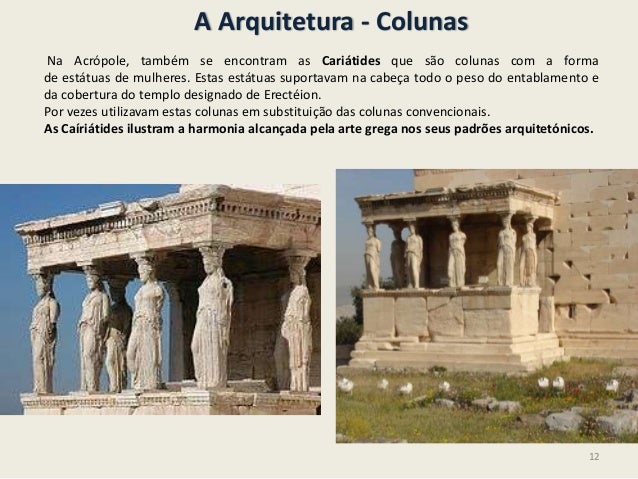 12. 12. A Arquitetura - ColunasNa Acrópole, também se encontram as Cariátides que são colunas com a formade estátuas de mulheres. Estas estátuas suportavam na cabeça todo o peso do entablamento eda cobertura do templo designado de Erectéion.Por vezes utilizavam estas colunas em substituição das colunas convencionais.As Caíriátides ilustram a harmonia alcançada pela arte grega nos seus padrões arquitetónicos.12