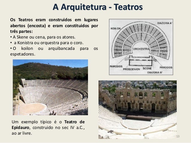 13. 13. A Arquitetura - TeatrosOs Teatros eram construidos em lugaresabertos (encosta) e eram constituidos portrês partes:• A Skene ou cena, para os atores.• a Konistra ou orquestra para o coro.• O koilon ou arquibancada para osespetadores.Um exemplo típico é o Teatro deEpidauro, construido no sec IV a.C.,ao ar livre.13
