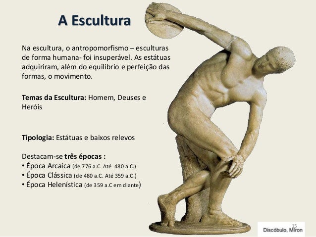 15. 15. A EsculturaTipologia: Estátuas e baixos relevosDestacam-se três épocas :• Época Arcaica (de 776 a.C. Até 480 a.C.)• Época Clássica (de 480 a.C. Até 359 a.C.)• Época Helenística (de 359 a.C em diante)Temas da Escultura: Homem, Deuses eHeróisNa escultura, o antropomorfismo – esculturasde forma humana- foi insuperável. As estátuasadquiriram, além do equilibrio e perfeição dasformas, o movimento.15
