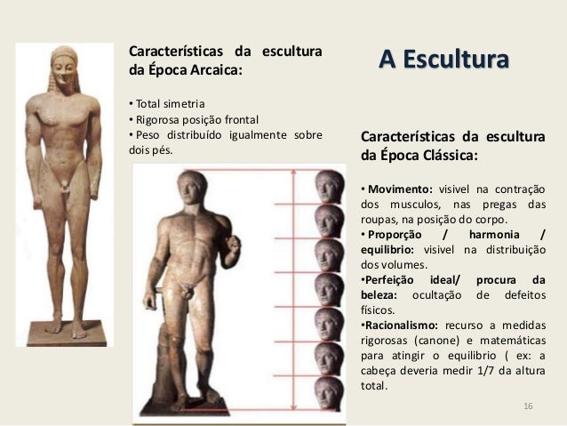 16. 16. A EsculturaCaracterísticas da esculturada Época Arcaica:• Total simetria• Rigorosa posição frontal• Peso distribuído igualmente sobredois pés.Características da esculturada Época Clássica:• Movimento: visivel na contraçãodos musculos, nas pregas dasroupas, na posição do corpo.• Proporção / harmonia /equilibrio: visivel na distribuiçãodos volumes.•Perfeição ideal/ procura dabeleza: ocultação de defeitosfísicos.•Racionalismo: recurso a medidasrigorosas (canone) e matemáticaspara atingir o equilibrio ( ex: acabeça deveria medir 1/7 da alturatotal.16