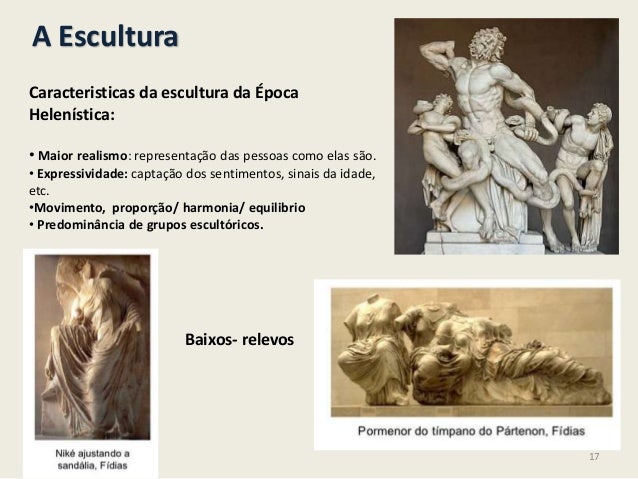 17. 17. A EsculturaCaracteristicas da escultura da ÉpocaHelenística:• Maior realismo: representação das pessoas como elas são.• Expressividade: captação dos sentimentos, sinais da idade,etc.•Movimento, proporção/ harmonia/ equilibrio• Predominância de grupos escultóricos.Baixos- relevos17