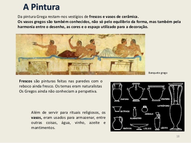 18. 18. A PinturaDa pintura Grega restam-nos vestígios de frescos e vasos de cerâmica.Os vasos gregos são também conhecidos, não só pelo equilibrio da forma, mas também pelaharmonia entre o desenho, as cores e o espaço utilizado para a decoração.Frescos são pinturas feitas nas paredes com oreboco ainda fresco. Os temas eram naturalistasOs Gregos ainda não conheciam a perspetiva.Além de servir para rituais religiosos, osvasos, eram usados para armazenar, entreoutras coisas, água, vinho, azeite emantimentos.Banquete grego18
