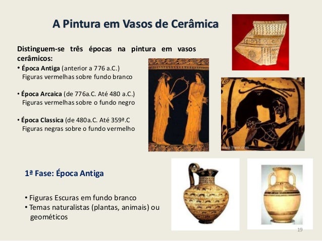 19. 19. A Pintura em Vasos de CerâmicaDistinguem-se três épocas na pintura em vasoscerâmicos:• Época Antiga (anterior a 776 a.C.)Figuras vermelhas sobre fundo branco• Época Arcaica (de 776a.C. Até 480 a.C.)Figuras vermelhas sobre o fundo negro• Época Classica (de 480a.C. Até 359ª.CFiguras negras sobre o fundo vermelho1ª Fase: Época Antiga• Figuras Escuras em fundo branco• Temas naturalistas (plantas, animais) ougeométicos19