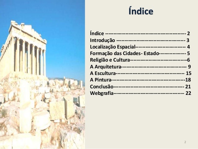 2. 2. ÍndiceÍndice ------------------------------------------------ 2Introdução ----------------------------------------- 3Localização Espacial------------------------------ 4Formação das Cidades- Estado---------------- 5Religião e Cultura----------------------------------6A Arquitetura--------------------------------------- 9A Escultura----------------------------------------- 15A Pintura--------------------------------------------18Conclusão------------------------------------------ 21Webgrafia------------------------------------------ 222